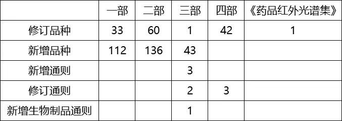 一部新增品種33個(gè),修訂品種112個(gè);二部新增品種60個(gè),修訂品種136個(gè);三部新增生物制品通則1個(gè),新增品種1個(gè),修訂品種43個(gè),新增通則3個(gè),修訂通則2個(gè);四部修訂通則3個(gè),修訂品種42個(gè);《藥品紅外光譜集》(第五卷)修訂品種1個(gè)。