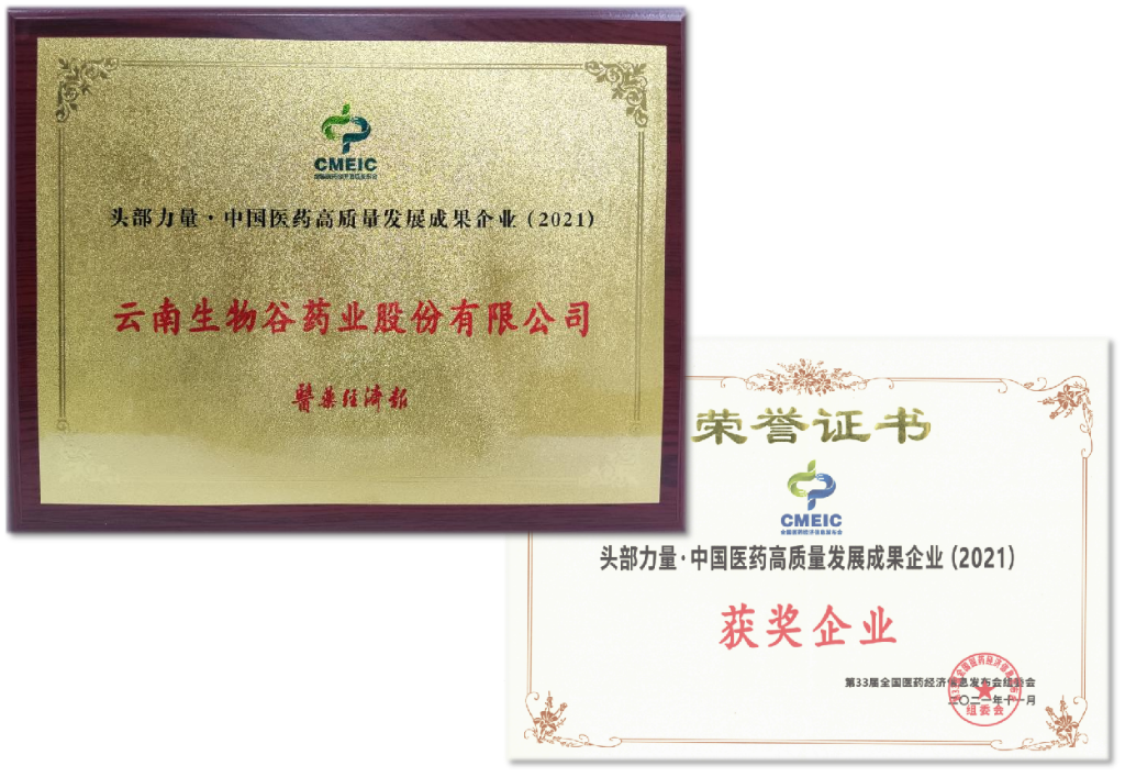 在本次高峰會議中,一并頒發了原定于2021年度11月份召開,因疫情原因延遲的第33屆(2021年度)全國醫藥經濟信息發布會的行業頭部力量重磅獎項,云南生物谷藥業獲得“頭部力量·中國醫藥高質量發展成果企業”榮譽,成為行業百強之一,公司產品燈盞生脈膠囊獲得“頭部力量·中國醫藥高質量發展品牌”榮譽。