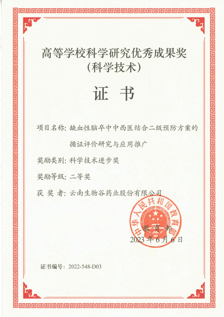 近日,2022年度國(guó)家高等學(xué)校科學(xué)研究?jī)?yōu)秀成果獎(jiǎng)(科學(xué)技術(shù))獎(jiǎng)項(xiàng)評(píng)定頒布,由廣州中醫(yī)藥大學(xué)牽頭、云南生物谷藥業(yè)股份有限公司聯(lián)合共同完成的“缺血性腦卒中中西醫(yī)結(jié)合二級(jí)預(yù)防方案的循證評(píng)價(jià)研究與應(yīng)用推廣”項(xiàng)目榮獲國(guó)家教育部科學(xué)技術(shù)進(jìn)步獎(jiǎng)二等獎(jiǎng),這是本年度廣州中醫(yī)藥大學(xué)唯一牽頭獲得該獎(jiǎng)項(xiàng)的項(xiàng)目,也是我公司首度與高校科研機(jī)構(gòu)研發(fā)合作獲得教育部重大獎(jiǎng)項(xiàng)。